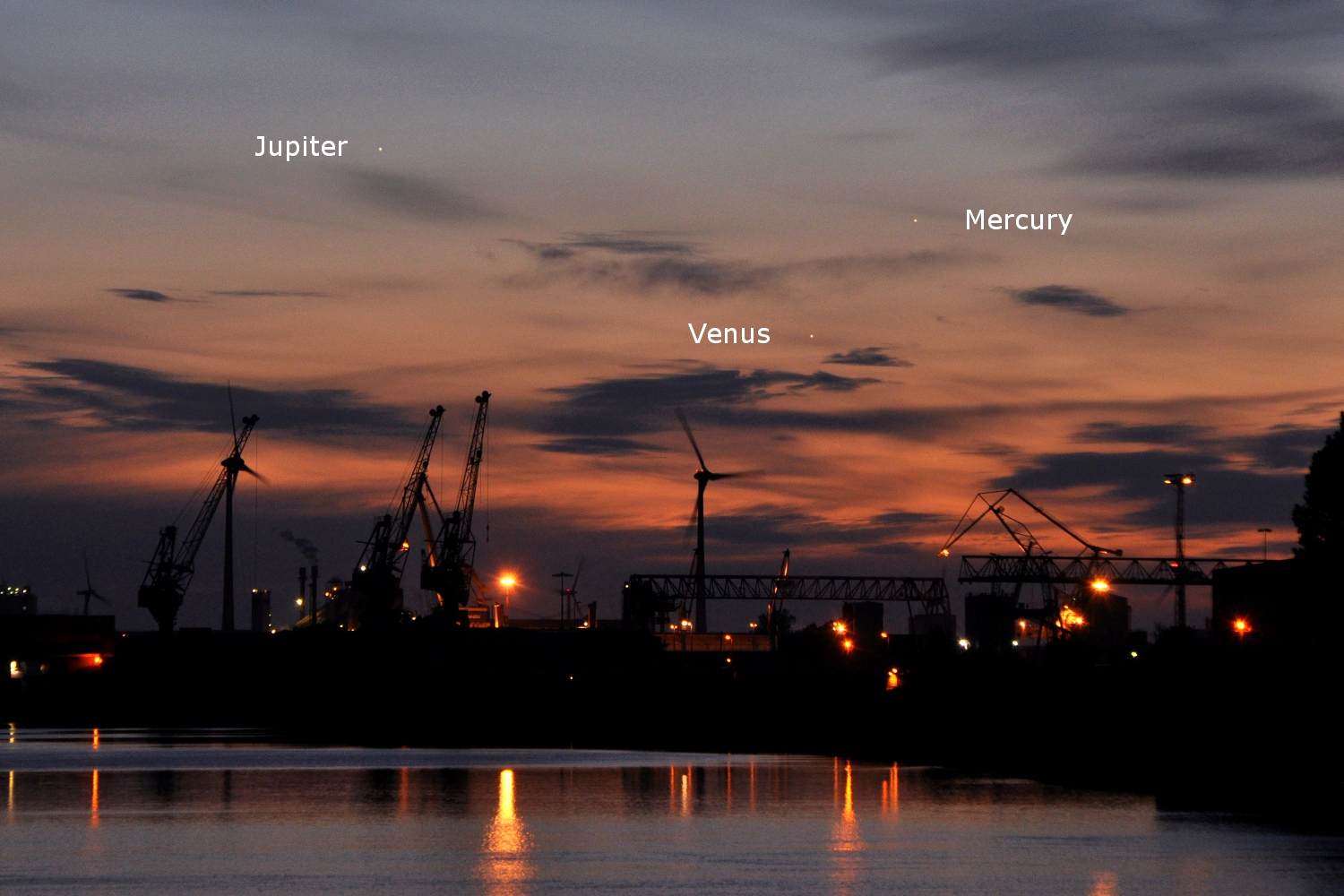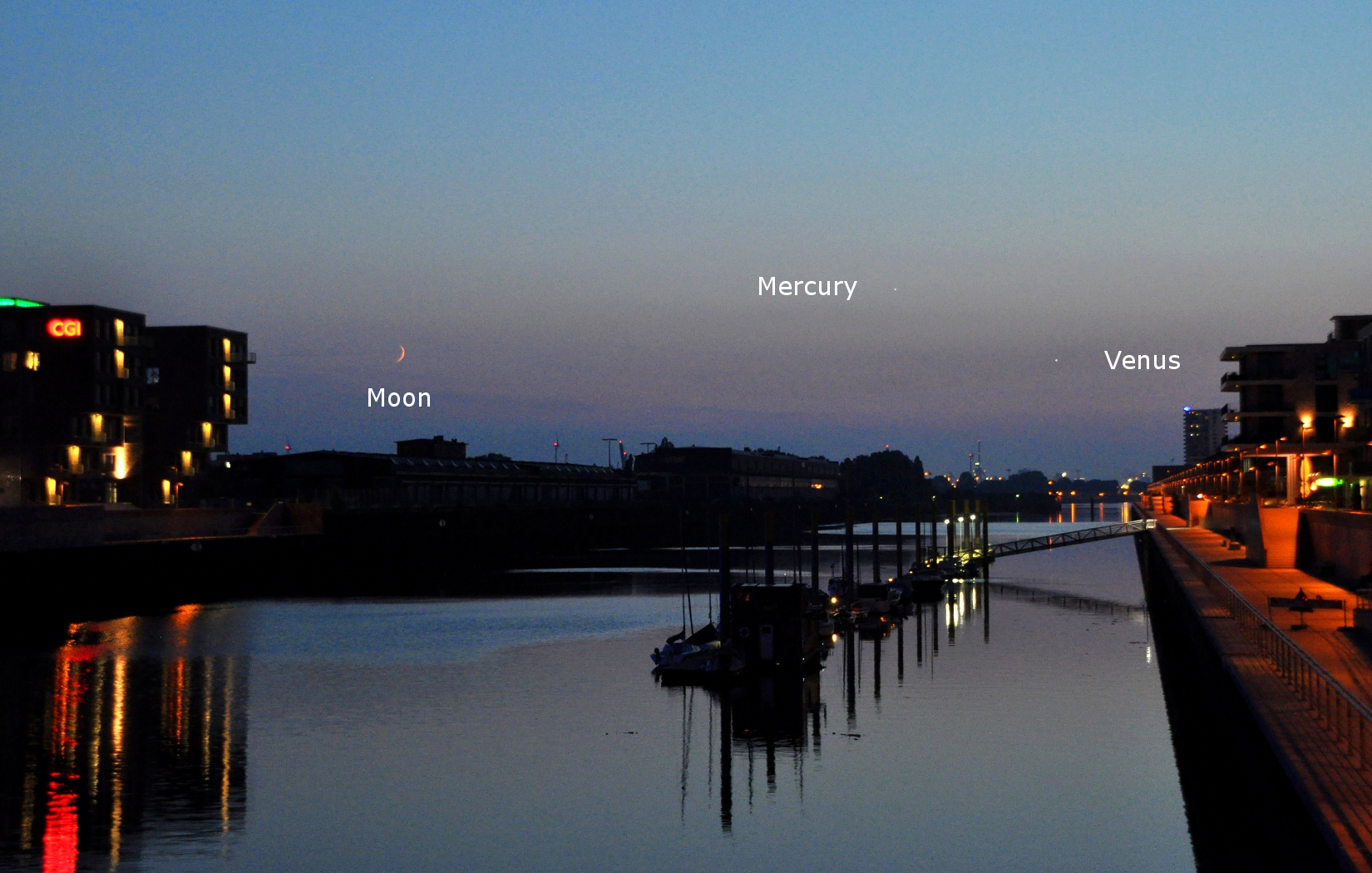 Moon and planetary conjunction of Venus and Mercury; Europahafen,