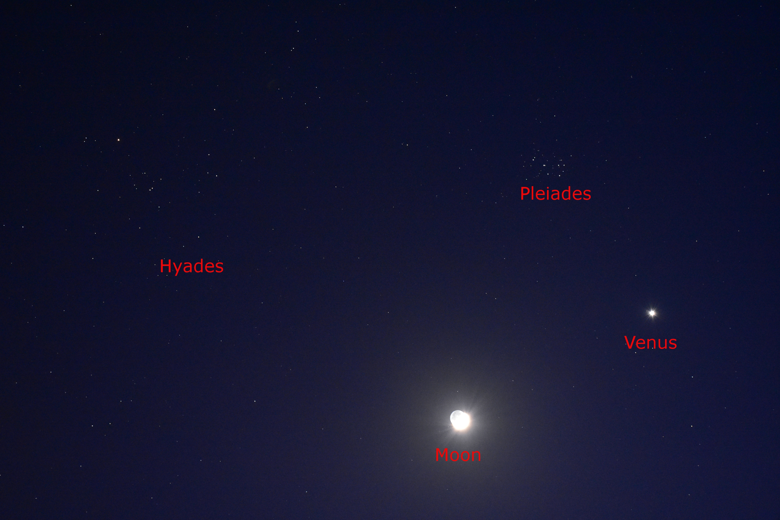 Other objects: constellations Orion and Taurus; Moon and Venus.